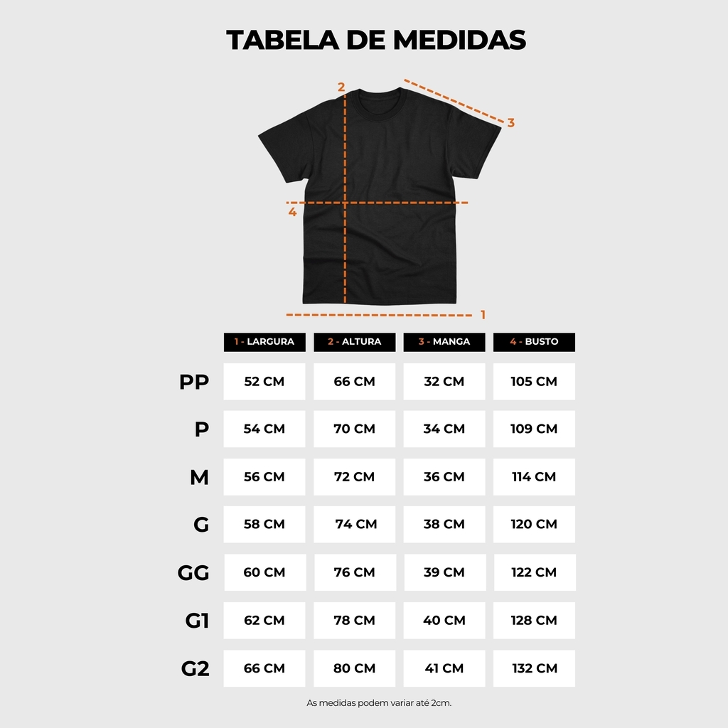 Nossas peças possuem modelagem streetwear, que costuma ter um caimento diferente (mais amplo) do padrão tradicional. Recomendamos que você compare as medidas com alguma peça que já tenha, isso aumenta muito as chances de acertar na escolha.